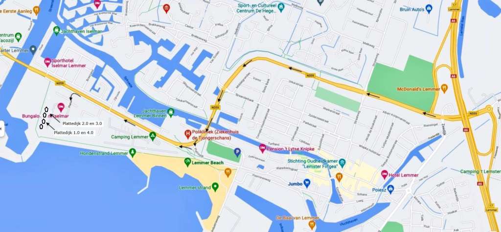 Het vakantiehuisje is gelegen op het vakantiepark Iselmar aan de Plattedijk te Lemmer. Dit park in Friesland heeft een gunstige ligging ten opzichte van al het moois dat Lemmer te bieden heeft. Zo loop je vanuit het park in enkele minuten naar het strand en kun je ook te voet naar het winkelcentrum en de supermarkten in Lemmer. Je auto kun je kwijt op de grote parkeerplaats van het park; de auto kan niet naast het huisje staan.